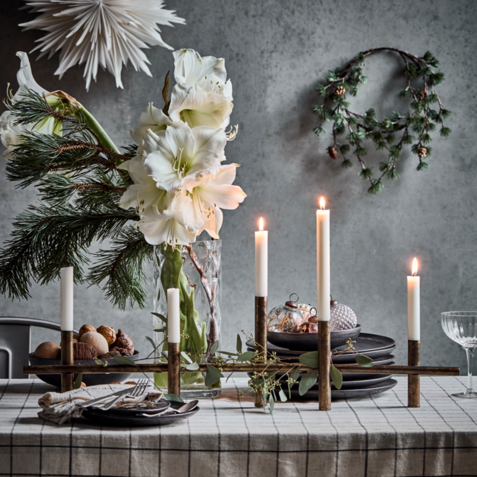 Our handcrafted Antique Brass Candle Stand is a minimalist design crafted from iron with an antique brass finish. This sturdy candle display is freestanding and looks stunning as a table centrepiece or on a sideboard. Decorate with foliage and branches for the festive season but keep this beautiful display out all year round!