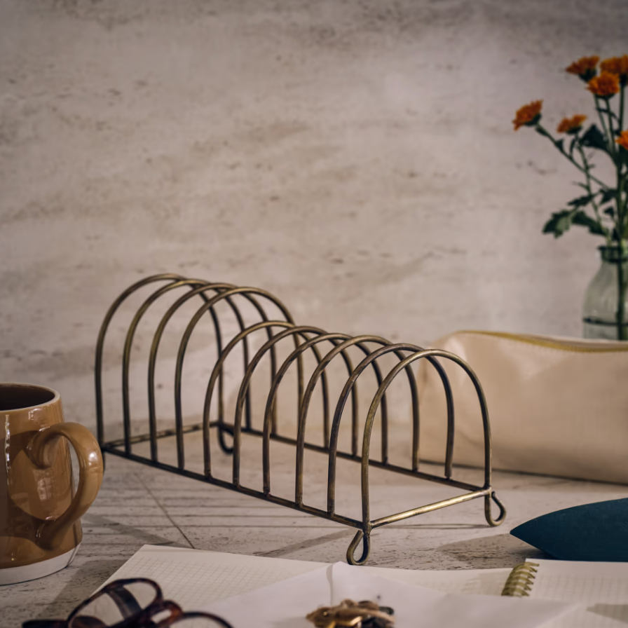 This Antique Brass Storage Rack is ideal for keeping magazines, letters and paperwork satisfyingly organised. Nine slots provide plenty of space for everything, while its elegant curved design enhances the aesthetic of any room.