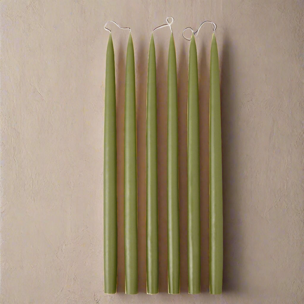 An essential for creating an inviting table setting, our Set of 6 Olive Taper Candles look stunning placed along the dining table. Pair with a candlestick for some dramatic height. Handcrafted to burn drip free and smokeless.