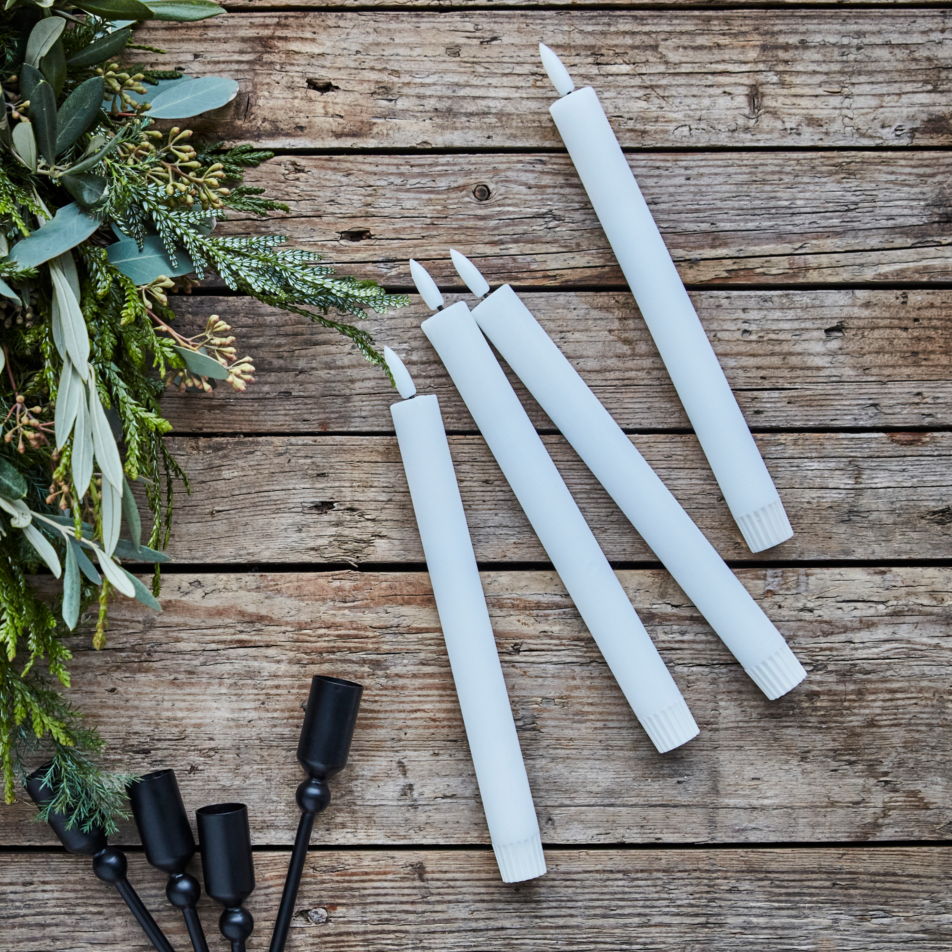 This Set of White LED Dinner Candles is very realistic with a flickering glow that mimics a real flame and a wax feel. An essential for creating an endlessly inviting table setting without the worry of a real flame.